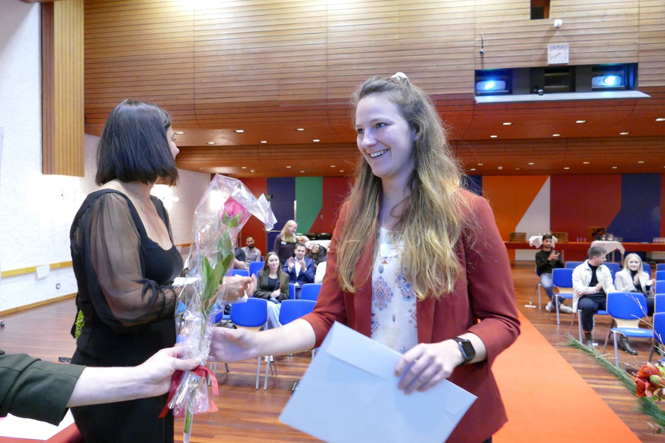 Sie liess die Prüfungen nochmals Revue passieren. Da hatten sicher einige die Erinnerung an diese Tage vor Augen. Die eidgenössischen Prüfungen sind nicht ganz einfach, auch für die, die während der Ausbildung immer vor Augen hatten DRANBLEIBEN, DRANBLEIBEN, DRANBLEIBEN. Für die, die an diesem Abend an der Abschlussfeier vor Ort waren, ist es gut ausgegangen. Die 5 besten Abschlüsse haben wir mit einem Blumenstrauss und einem Goldregen gefeiert. Ein tolles Ergebnis – herzlichen Glückwunsch!